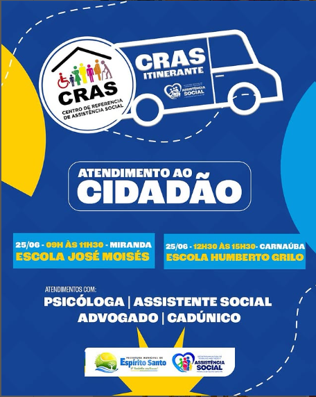 O CRAS Itinerante vai estar nas comunidades de Miranda e Carnaúba nesta quarta, 25 de junho, levando atendimento gratuito com psicóloga, assistente social, advogado e CadÚnico.