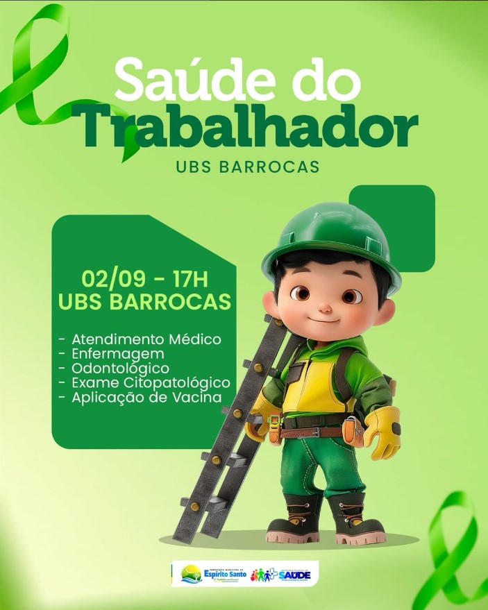No dia 02/09, às 17h, na UBS Barrocas, vamos viver um momento especial dedicado à Saúde do Trabalhador. Será uma tarde de cuidado e prevenção, com atendimento médico, enfermagem, odontologia, exame citopatológico e também aplicação de vacinas. Tudo pensado para valorizar e cuidar de quem constrói o futuro todos os dias.